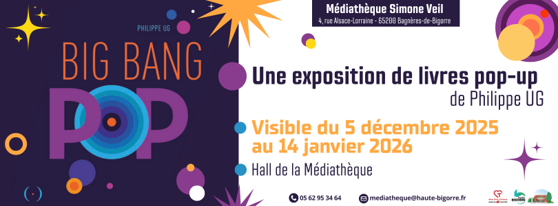 Exposition de livres Pop-Up de Philippe UG du 5 décembre au 14 janvier 2026 Exposition de livres Pop-Up de Philippe UG du 5 décembre au 14 janvier 2026 Prochaine session Du vendredi 05 décembre 2025 à 14:00 au mercredi 14 janvier 2026 à 18:00 Ical Public Tous publics Secteur Haute-Bigorre Lieu Médiathèque de la Haute-Bigorre Voir le détail de l'événement